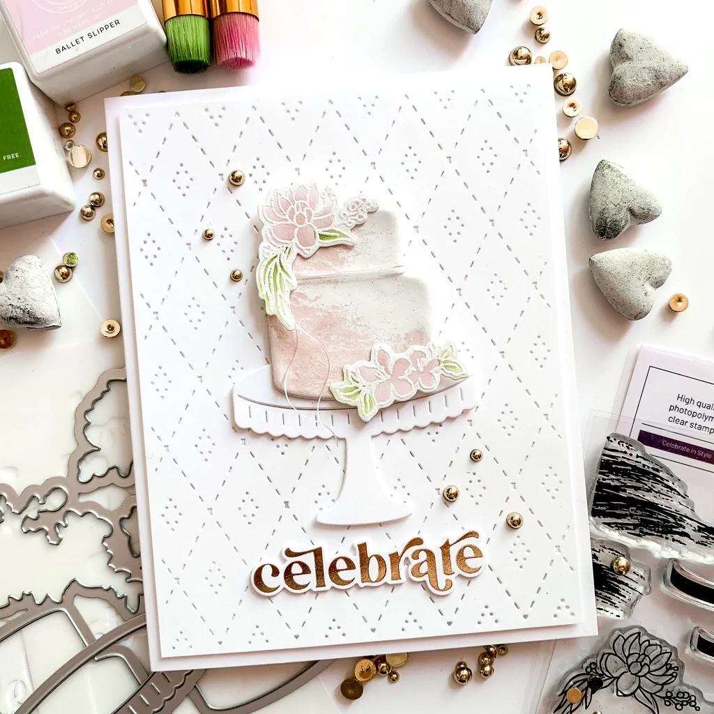 4 x 6 photopolymer clear stamp set designed by Inna Moreva. Made to coordinate with the Celebrate in Style die set & Celebrate in Style layering stencil set. Available for purchase separately. Celebrate weddings, engagements, birthdays and more with this on trend and modern stamp set! The cakes and florals are merged into one stamp, making them easy to line up with both the layering stencils and 1 piece die. We've also included 4 stamps to add additional details to the cakes, giving them that modern & elegant feel. Easily ink blend colors to the cakes and flowers with the coordinating stencils in all your favorite shades of ink. You can also color the outline stamped image in your favorite mediums, including watercolor, markers and colored pencils. By offering different options within each design, you get the utmost of versatility when using our products! The following sentiments are included in the stamp set: -May this beautiful day be just the beginning of a lifetime filled with happiness -This calls for cake! -Happy Birthday -Let's celebrate