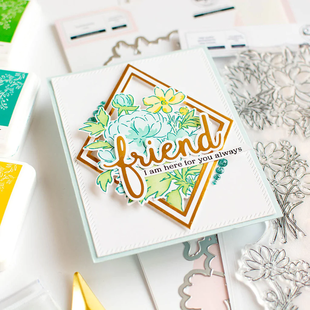6 piece layering stencil set made to coordinate with the Whimsical Blooms stamp set, and Whimsical Blooms dies. There is a separate stencil for each layer, with guidelines on each stencil for perfect alignment to a 3.6" x 8.6" cardstock panel when using alone. When using the stencils with the stamped image you will forego the alignment guides, and instead align each layer to the stamped image. Use them without the stamped image for a soft, no-line coloring feel. Use the coordinating stamp to add more detail to the image by stamping with detail black, or heat embossing in your favorite powder for added shine. Stencils measure approximately 4" x 9".
