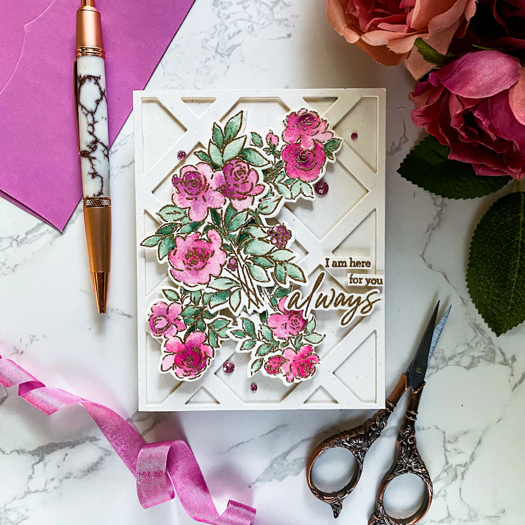 4 x 12 photopolymer clear stamp set designed by Valentine Leclerc. Made to coordinate with the Indigo Roses die, Indigo Roses layering stencils and Indigo Roses washi tape. Available for purchase separately. This innovative stamp includes all the floral clusters on one stamp, so it pairs perfectly with the 1-piece coordinating die. The 1-piece stamp is slightly larger than 8.5". It will likely fit at an angle in a standard stamping platform, or you will need to use a larger stamping platform. You can also use the hinged lid method that we have showcased in our Tips & Tricks section on our YouTube channel. Stamp the Indigo Roses outline images in all the different ink choices, including detail black, fadeout ink or heat emboss for some added shine. Then color them with your favorite medium, ink blend with the coordinating layering stencils or use them as just the outline for a modern feel. The clusters are perfect for all types of coloring; including watercolor, alcohol & brush markers, colored pencils and no-line coloring. Finish your card off with a friendly sentiment featured in this beautiful slimline sized stamp set! The following sentiments are included in the stamp set: -You make my heart bloom -I am here for you always -Your kindness is the greatest expression of your beauty