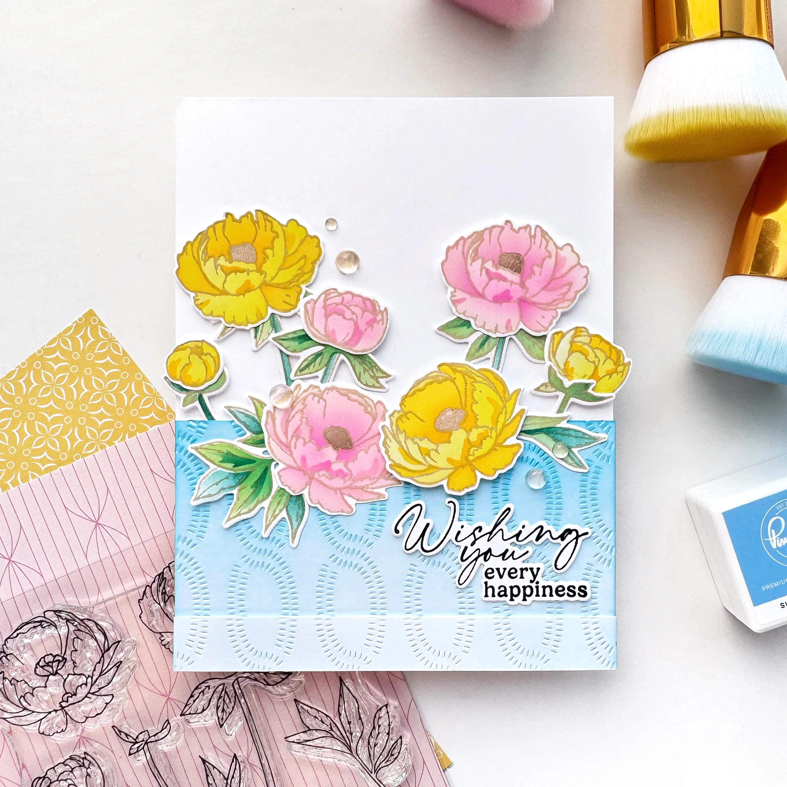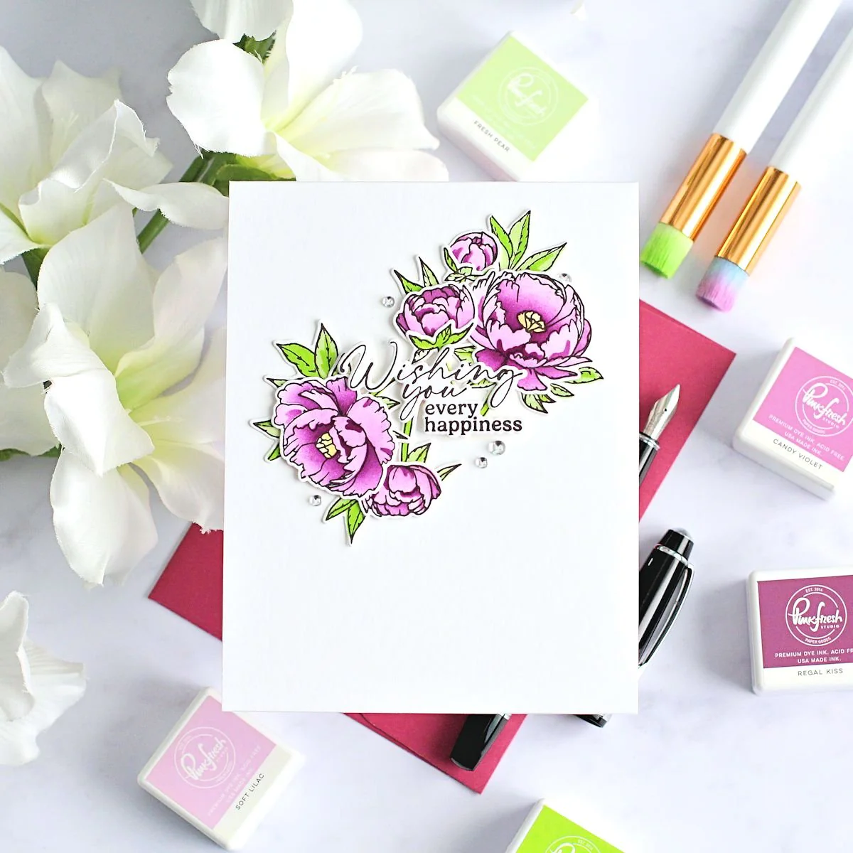 Add elegance to your projects with these stunning florals designed by TaeEun Yoo. This set includes lush blooms, buds, and stems so you can build custom floral clusters. Each flower is full of delicate detail and layered petals. Let these blushing peonies be the star of your next masterpiece. Coordinating products for purchase separately: Blushing Blooms die, Blushing Blooms stencil, Blushing Blooms press plate. The innovative design has images clustered together on one large stamp, allowing you to stamp all images simultaneously. The coordinating stencils make you feel like an artist, quickly and easily coloring in multiple images. Use the coordinating one-piece die to cut every design in one pass, giving you more time to create! All that's left to do is select a sentiment! Details: 4" x 6", 3 pieces, Made with high-quality photopolymer in the USA, Packaging includes a finished, full-color example. Sentiments included in the stamp set: You make everything better, Wishing you every happiness.
