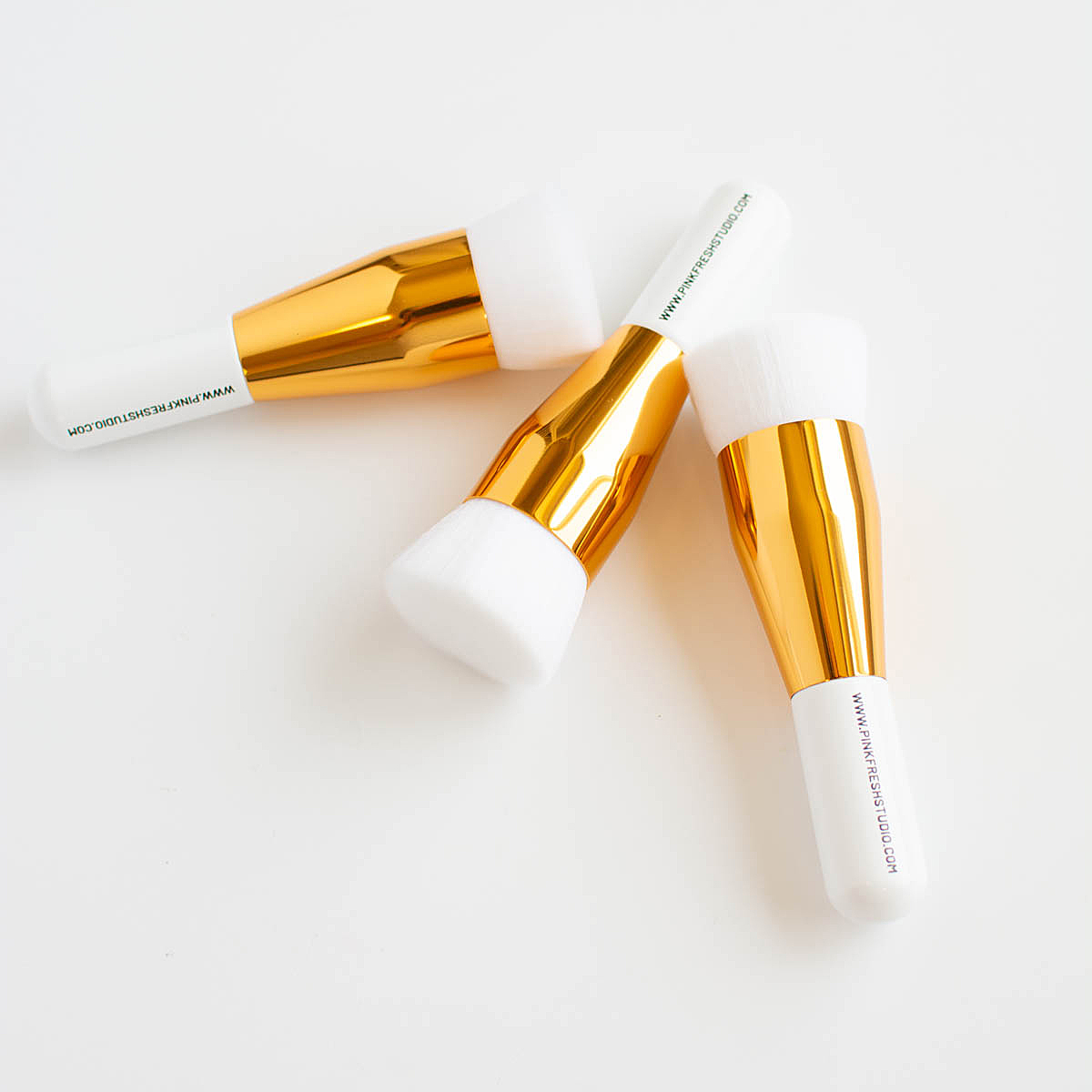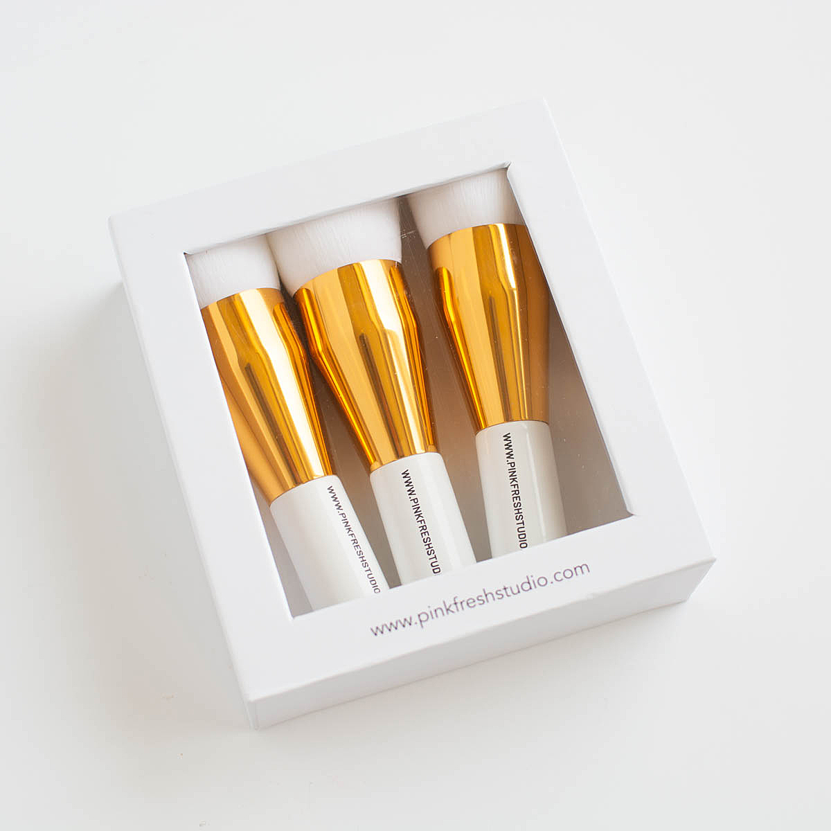 Introducing our sleek & modern 1" Blending Brush set. The latest blending brush addition to our Studio Essentials collection, the larger brush size easily ink blends larger surface areas. Each set includes (3) 1" blending brushes that offer a white lacquer handle with the Pinkfresh Studio website printed in a modern black typeface, gold ferrule and high quality vegan bristles. These are perfect for blending large coverage stencils layers, backgrounds and more! Wondering the best way to store them? Each Blending Brush set comes in a high quality white box with a peekaboo window and a ribbon pull to slide the brushes out. They are sleek & compact, and will fit easily into drawers, carts and totes when you are on the go!