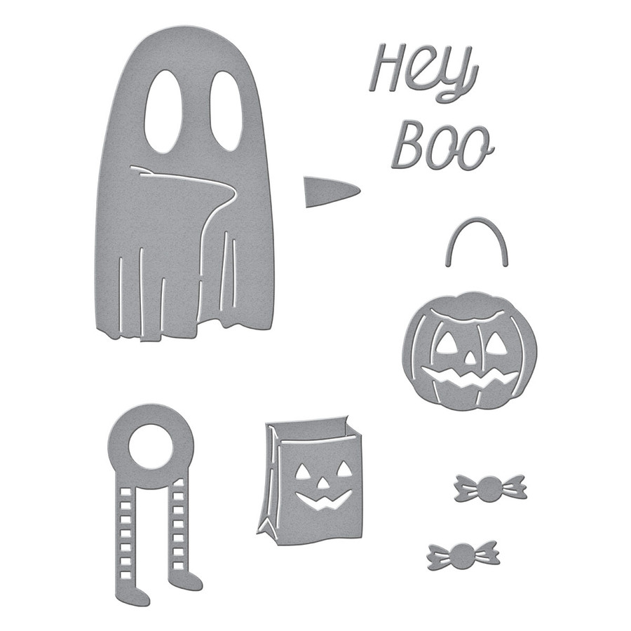 This Dancin' Ghost Etched Dies is part of the Boo Dance Party Collection with a set of six thin metal cutting dies. When assembled, it creates an adorable ghost! For more cuteness, it dances with its moving legs! The set includes treat containers, candy and "Hey Boo" too! The assembled Dancin' Ghost measures 1.84 x 3.45 in./4.70 x 8.80 cm. If the ghost needs a dance partner, look to S3-466 Dancin' Mummy set! This collection is SPOOKtacular! The Boo Dance Party Collection has fun elements from interactive designs, fabulous backgrounds to a stamp set that ties it all together. A must-have collection for Halloween fans and the occasional ghoul want-to-be! Approximate Size: Ghost Body: 1.56 x 2.74 in./3.90 x 6.90 cm, Ghost Arm: 0.50 x 0.28 in./1.30 x 0.70 cm, Dancin' Legs: 1.76 x 0.82 in./4.50 x 2.10 cm, Hey: 0.82 x 0.51 in./2.10 x 1.30 cm, Boo: 0.80 x 0.47 in./2.10 x 1.20 cm, Treat Bag: 1.11 x 0.94 in./2.80 x 2.40 cm, Jack o' Lantern: 1.17 x 1.04 in./3.00 x 2.60 cm, Candle: 0.54 x 0.46 in./1.40 x 1.20 cm, Candy (2 pcs): 0.64 x 0.27 in./1.60 x 0.70 cm