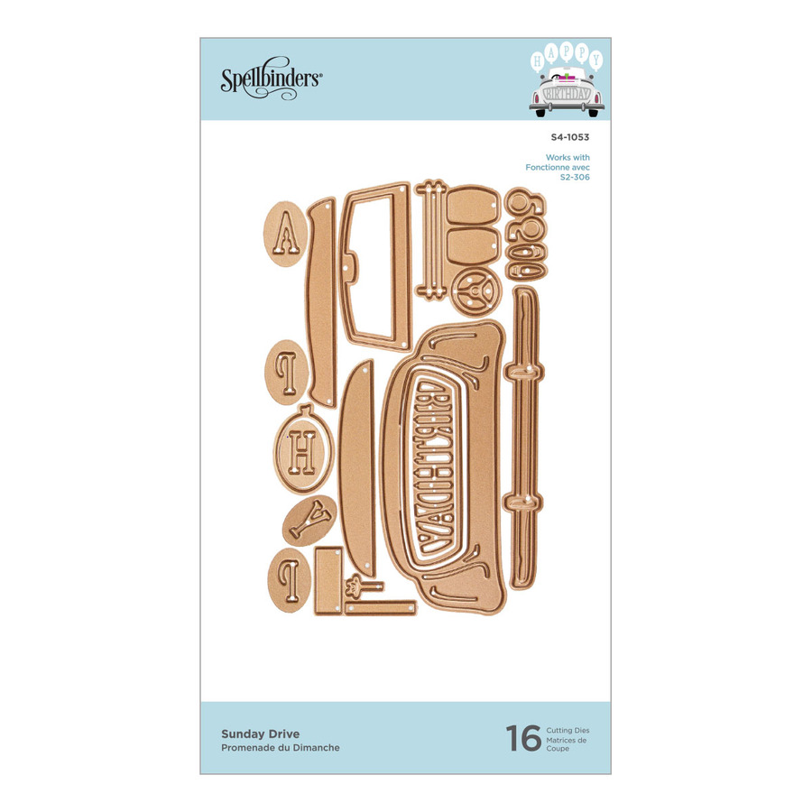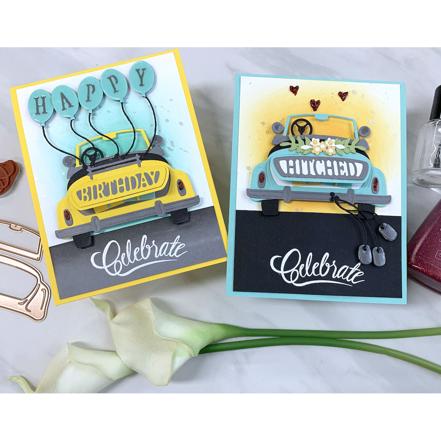 Sunday Drive Etched Dies is a set of 16 thin metal dies. This has everything you need for a fun drive around town. Add in the presents, balloons and Birthday Insert to change the occasion! Truly a great addition to any card maker's collection. Works with S2-306 Die D-Lites Sunday Drive - Hitched Etched Dies set for a wedding theme. Approximate Size: Car Frame: 3.30 x 1.40 in. 8.40 x 3.60 cm, Trunk Rim: 2.25 x 0.65 in. 5.70 x 1.70 cm, Birthday Insert: 2.10 x 0.50 in. 5.30 x 1.30 cm, Windshield: 1.90 x 0.80 in. 4.80 x 2.00 cm, Bumper: 3.45 x 0.40 in. 8.80 x 1.00 cm, Seat: 2.40 x 0.30 in. 6.10 x 0.80 cm, Top: 2.50 x 0.40 in. 6.40 x 1.00 cm, Rack: 1.30 x 0.35 in. 3.30 x 0.90 cm, Steering Wheel: 0.55 x 0.55 in. 1.40 x 1.40 cm, Tires (2 pcs): 0.40 x 0.60 in. 1.00 x 1.50 cm, Tailight (2 pcs): 0.20 x 0.40 in. 0.50 x 1.00 cm, Rear View (2 pcs): 0.30 x 0.40 in. 0.8 0x 1.00 cm, Balloon: 1.00 x 0.65 in. 2.50 x 1.70 cm, Balloon Insert (5 pcs): 0.80 x 0.50 in. 2.00 x 1.30 cm, Assembled Box: 0.75 x 0.35 in. 1.90 x 0.90 cm, Bow: 0.30 x 0.45 in. 0.80 x 1.10 cm.