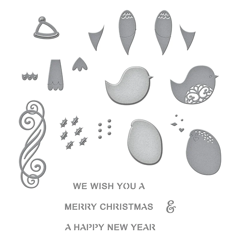 The Sugarplum Tweets Etched Dies are from the Christmas Flourish Collection by Becca Feeken and has 20 thin metal cutting dies. The set includes two detailed cardinals, along with holiday sentiments that cut into the paper. In addition, there are holly berry and leaf, flourish accent and a hat for the birds! Christmas Flourish have hints of flourish designs throughout its collection. Everything you'll need to make a holiday greeting from thin metal cutting dies to a sweet embossing folder. Mix and match to create amazing card creations! Approximate Size: Holly Leaf (6 pcs): 0.24 x 0.50 in./0.60 x 1.00 cm, Holly Berry (6 pcs): 0.12 x 0.12 in./0.30 x 0.30 cm, We Wish You: 2.43 x 0.22 in./6.20 x 0.60 cm, Merry Christmas: 2.98 x 0.22 in./7.60 x 0.60 cm, A Happy New Year: 2.98 x 0.22 in./7.60 x 0.60 cm, Ampersand: 0.32 x 0.44 in./0.80 x 1.10 cm, Flourish: 3.00 x 0.92 in./7.60 x 2.30 cm, Flourish Bird Body: 1.65 x 1.35 in./4.20 x 3.40 cm, Tail: 0.52 x 0.49 in./1.30 x 1.20 cm Eye (2 pcs): 0.08 x 0.08 in./0.20 x 0.20 cm, Hat Outline: 0.85 x 0.76 in./2.20 x 1.90 cm, Hat Insert: 0.33 x 0.51 in./0.80 x 1.30 cm, Spotted Bird Body: 1.24 x 1.51 in./3.20 x 3.80 cm, Wing (2 pcs): 0.59 x 1.54 in./1.50 x 3.90 cm, Wing Layer (2 pcs): 0.55 x 0.91 in./1.40 x 2.30 cm, Tail: 0.54 x 1.06 in./1.40 x 2.70 cm, Tail Layer: 0.54 x 0.31 in./1.40 x 0.80 cm, Beak: 0.25 x 0.12 in./0.60 x 0.30 cm, Heart: 0.18 x 0.15 in./0.40 x 0.40 cm.