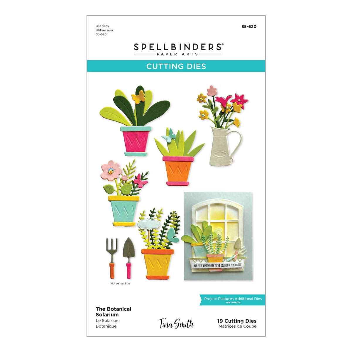 The Botanical Solarium Etched Dies are part of the Windows with a View Collection by Tina Smith. These 19 thin metal cutting dies are perfect for the plant loving paper crafters! Create many plant combinations with a choice of two containers or use without and make a bouquet. So fun to have butterflies and a garden shovel in the mix. It can be used alone, but it is designed with S5-626 Vista View Window set in mind.