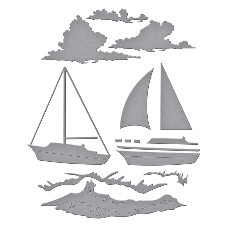 Set Sail Etched Dies are part of the Fair Winds Collection by Dawn Woleslagle. Create the perfect vessel for sailing off into the sunset with this set of eleven thin metal cutting dies. Assembled, this set creates a lovely sailboat navigating ocean waves beneath a cloudy sky. Full of realistic details and charming nautical elements, you'll love customizing this boat before it sets sail. Combine with S4-1343 Guiding Light Etched Dies to create a full coastal scene of a lighthouse watching over stormy seas. Dawn Woleslagle's Fair Winds collection is full of her signature seascape charm and beautifully detailed scenes. With nautical themes throughout, it's perfect for capturing the feeling of summer all year long. Approximate Size: Sailboat Base: 2.37 x 2.77" 6.0 x 7.0 cm, Sailboat Hull Layer: 0.78 x 2.37" 1.7 x 6.0 cm, Sailboat Cabin Layer: 1.48 x 0.24" 3.8 x 0.6 cm, Sailboat Stripe Layer: 2.39 x 0.08" 6.1 x 0.2 cm, Curved Sail: 0.86 x 1.79" 2.2 x 4.6 cm, Straight Sail: 0.87 x 1.89" 2.2 x 4.8 cm, Large Cloud Base: 2.82 x 1.38" 7.2 x 3.5 cm, Medium Cloud Layer: 2.47 x 0.91" 6.3 x 2.3 cm, Small Cloud Layer: 1.76 x 0.42" 4.5 x 1.1 cm, Wave Base: 4.10 x 1.02" 10.4 x 2.6 cm, Small Whitecap Layer: 1.26 x 0.46" 3.2 x 1.2 cm, Large Whitecap Layer: 2.68 x 0.72" 9.3 x 1.8 cm