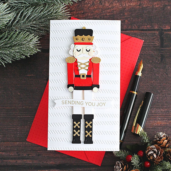 Dancin' Nutcracker Fritz Etched Dies are part of the Dancin' Christmas Friends Collection with a set of 28 thin metal cutting dies. When assembled, it creates this wonderful nutcracker with moving legs swing back and forth. He is one tall nutcracker measuring almost 6.50 inches tall! There are other fun accessories in the set.