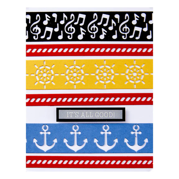 Classic Mouse Borders Etched Dies are from the Say Cheese Classic Mouse Collection and give the perfect touch to all your scrapbook pages and cards. This set of four borders channels Steamboat Willie's nautical origins and includes borders featuring an anchor, rope and helm, plus one full of music notes to whistle along with. With thier repeating patterns, these borders can be cut multiple times to create borders than stretch to any length. Use just one on a scrapbook page for a grounding element, or try all four together for an unforgettable card.