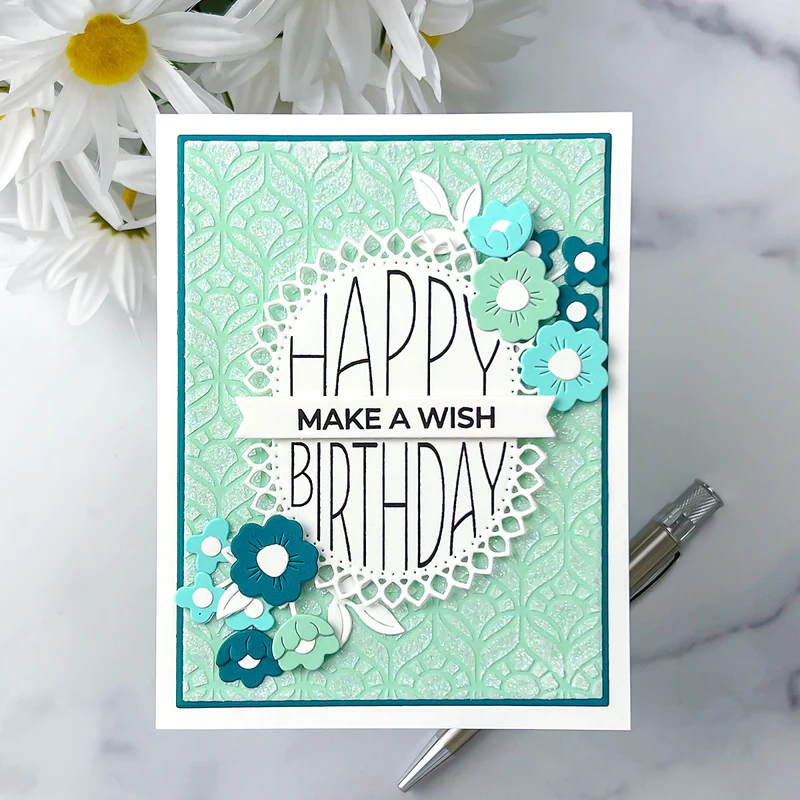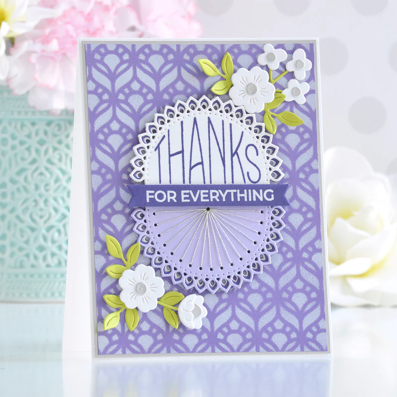Kaleidoscope Arch Sentiments Clear Stamp Set is part of the Kaleidoscope Arch Collection. The sentiments are designed to fit S4-1291 Stitched Kaleidoscope Arch Etched Dies in the arch and center banner section of the set. Also included are sweet floral patterns to use as accents or to create clusters. The stamps work with an acrylic block and were made in the USA.