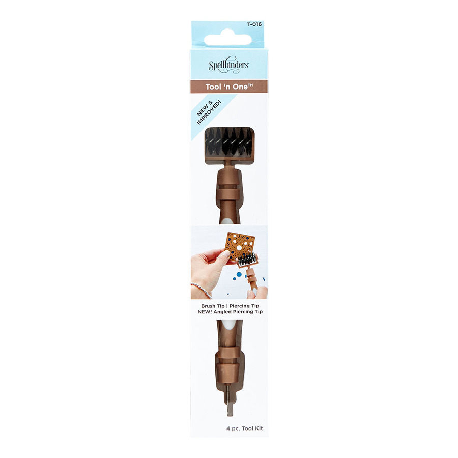 The New & Improved Tool 'n One has a brand new look and a new tip! The beautiful new white and bronze coloring perfectly coordinates with your Platinum or Platinum 6 Die Cutting Machines. The tool now comes with the consumer-preferred angled piercer, in addition to the brush head and straight piercer. The angled piercer is perfect for poking out paper bits and removing the paper backing off adhesive. Just like the original, the brush head easily removes paper pieces from dies and die cuts, and the straight piercer is perfect for poking out stubborn chads, or adding piercing elements to your projects. Swapping tips is easy, and the handy storage in the center of the tool keeps your extra tips protected. This is the must have tool for die cutters!