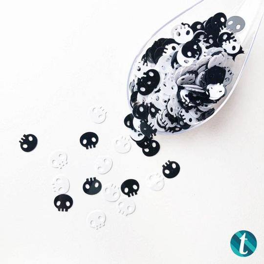 Black and White Skull confetti. Approx 1 tsp packaged in our plastic storage box.