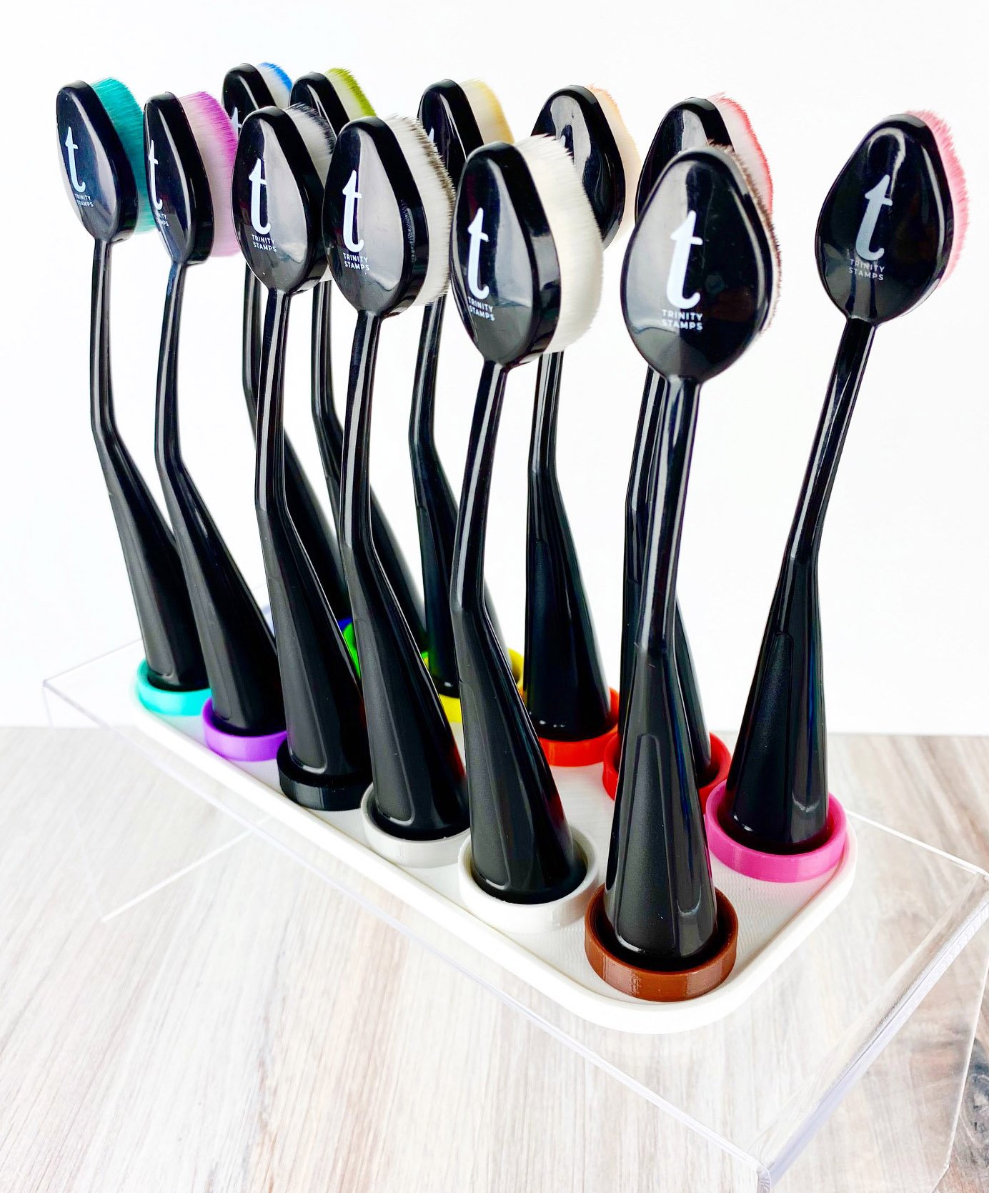 Our Blending bar system is the newest hangout for your blending buddy brushes. Place the color caps (sold separately) on the bottom of your Blending Buddy brushes and place on the metal platform base. No more tipping over your brushes while working on your projects. Available in a single or double platform base. Double Blending Bar Platform measures 8" x 3.5". The blending bar is 3-D printed by a small Oregon based business. * Note: The Platforms are not magnetic. They contain a metal shim inside the plastic. The Color Caps and accessories are magnetic and made to work with the Blending Bar Platforms.