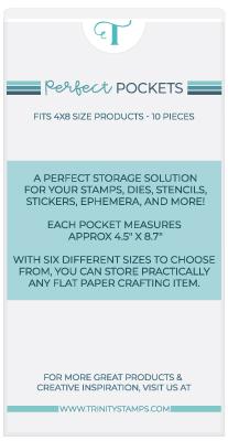 These little pockets are perfect to store your 4x8 stamps, dies, in progress card projects or other small items like stickers, stamped and die cut images, ephemera, the list goes on! Our pockets are a thick 10mil and feature a scoop notch at the top to access your item quickly and quickly put your item away. Each pocket measures approx 4.5" x 8.7" and a package contains 10 perfect pockets. Trinity Stamps Perfect Pockets are available in 6 different sizes and are exclusive to the Trinity Stamps Shop.