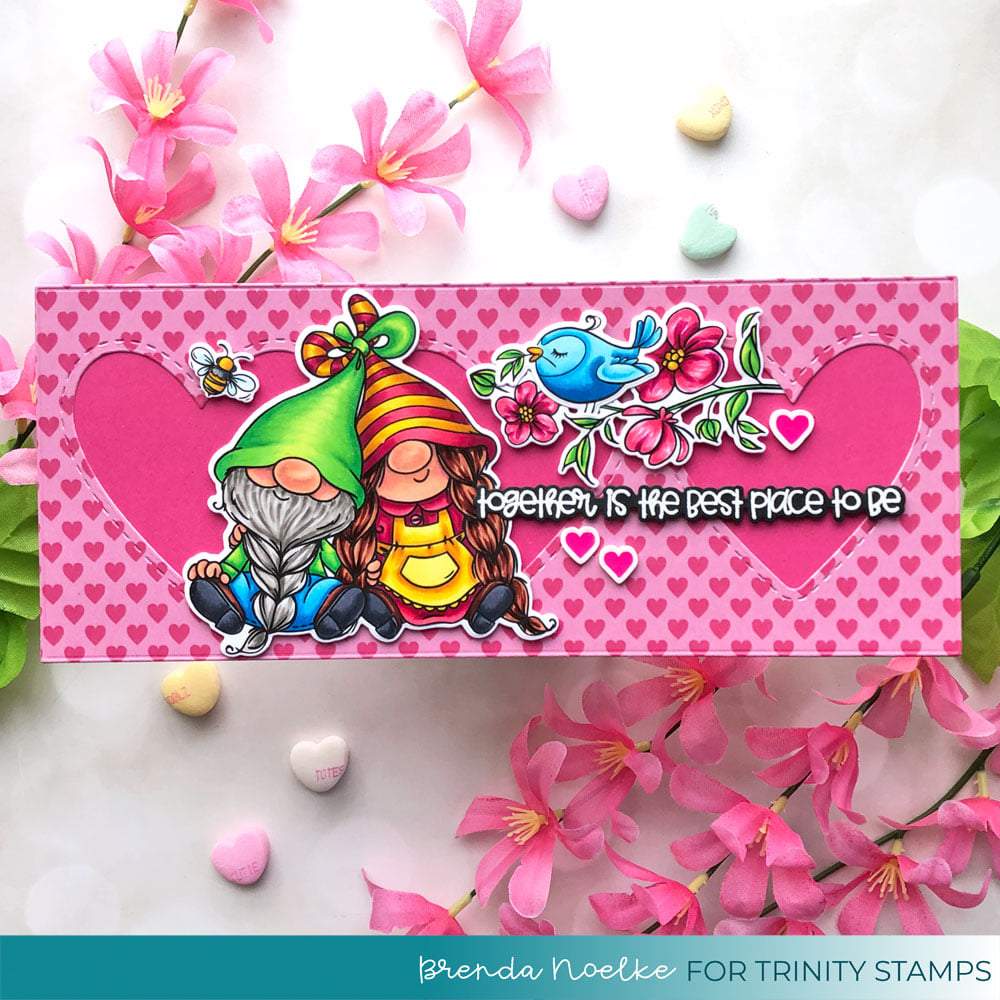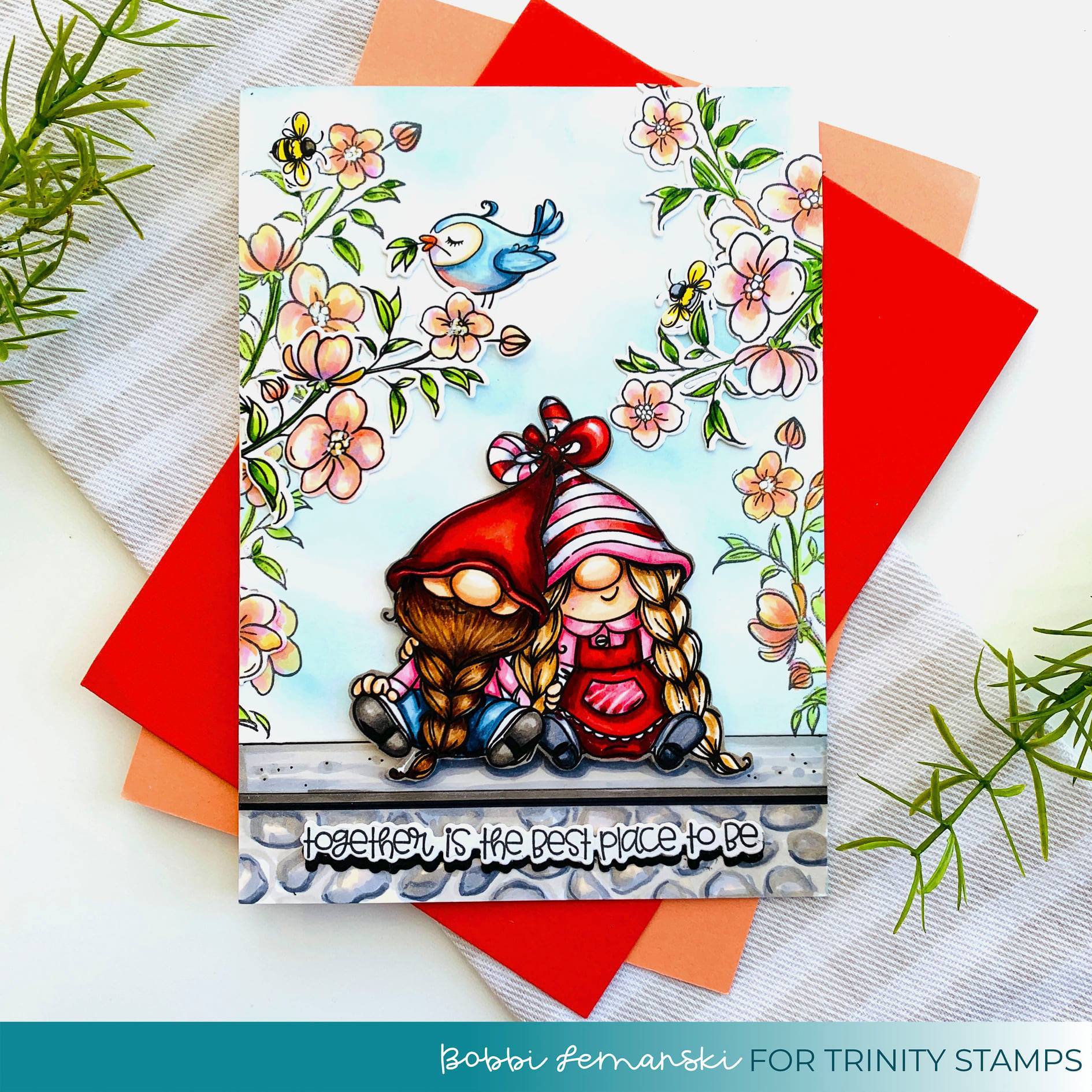 Our Best Place To Be stamp set features 5 stamps in total. One main image of a cute gnome couple, a flowering branch, a sweet little bird, and a cute honey bee as well as one sentiment. Gnome couple image measures approx. 3.4" x 3.3". A coordinating die set is available (sold separately).