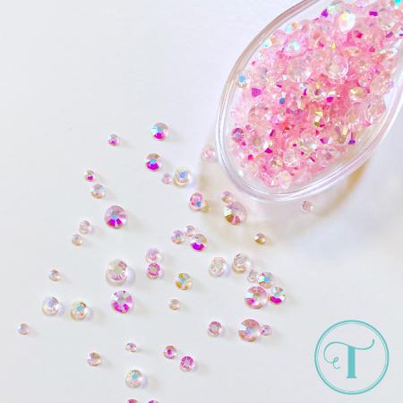 This embellishment selection contains a mix of light pink resin rhinestones in an assortment of sizes. Comes in a plastic storage box. .2 oz of embellishment (approx 1 - 1.5 tsp). These are tinted clear rhinestones with an iridescent coating on top.