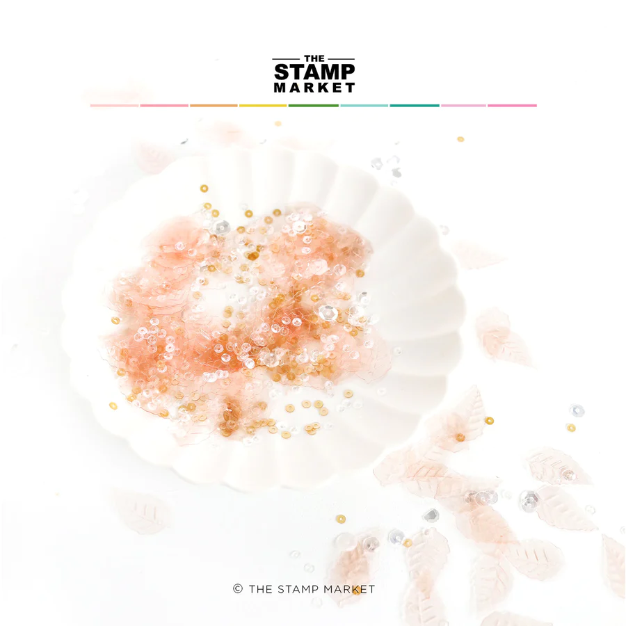 Gorgeous transparent peachy pink leafs with a touch of gold and crystal sparkles. Heaping Tbsp of mix.
