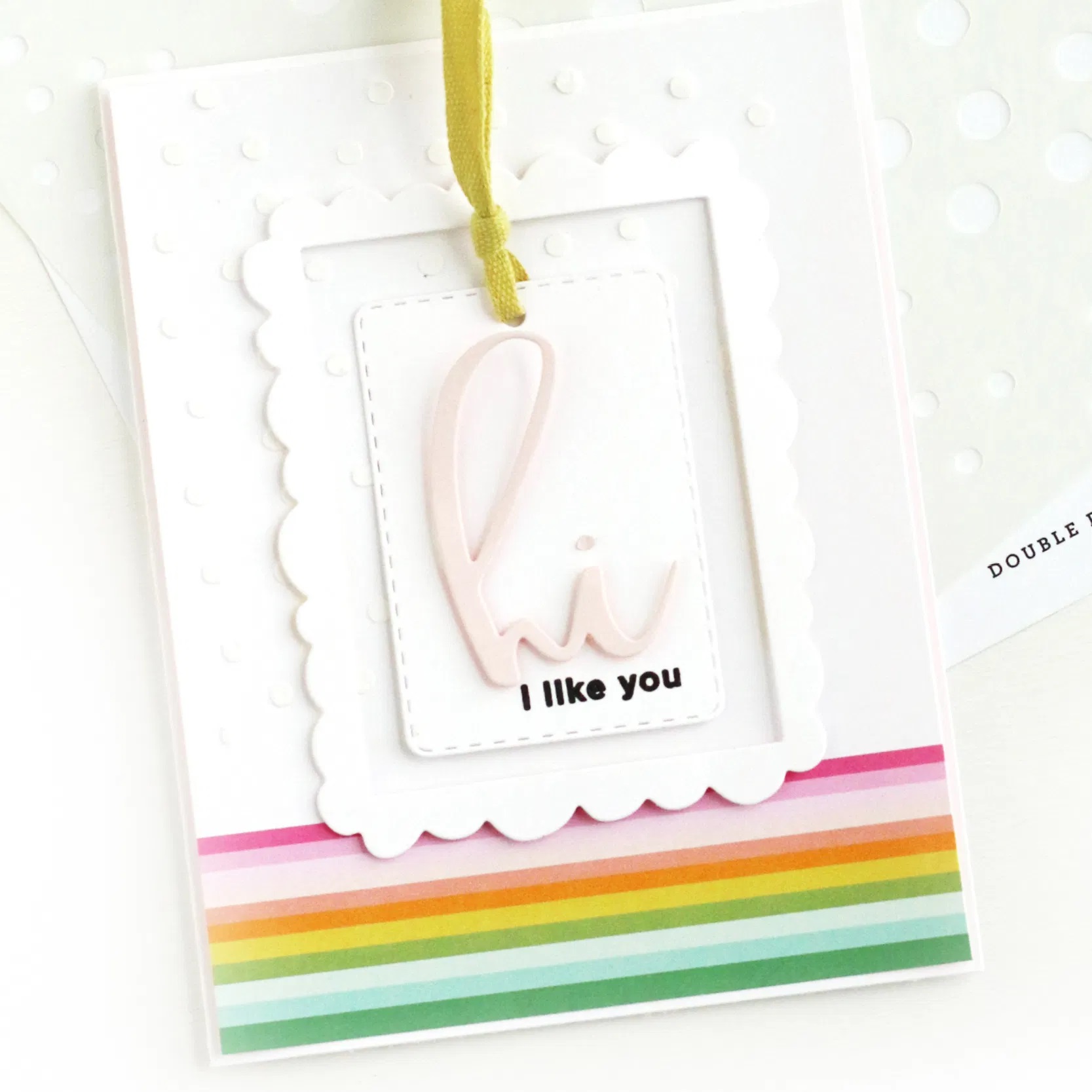3 Piece Metal edge dies. Cut a cute quirky scallop frame , a stitched edge tag and a little hi. Use them together to create a trio of layers with your favorite stamp set or use the pieces on their own to accent any card. Size is approx 3 x 3.75"