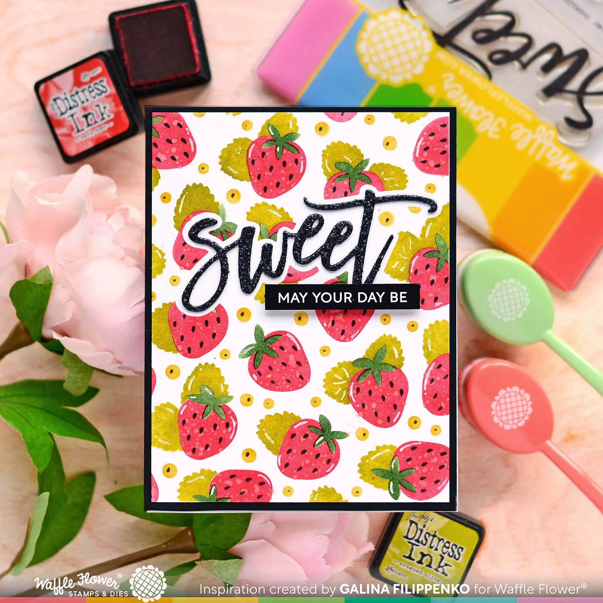 Create a "berry" sweet background with the Strawberries Background stencil! This fun set of 4 layering stencils helps you easily create a background with sweet strawberries and blueberries. Try to use glitter pastes with the 4th layer (the seeds) for additional shine! You may also like: Oversized Sweet Word Die, Sweet Plates Sentiments