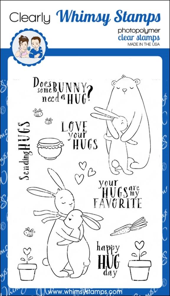 Clearly Whimsy Stamps Collection "Hugs Bunny" designed by Deb Davis - Amped2Stamp for Whimsy Stamps. A fun collection of bears and bunnies with sentiments perfect for sending hugs to loved ones and friends. High quality photopolymer clear stamps, use with an acrylic block Approximate size in inches: 4 x 6 polymer sheet.