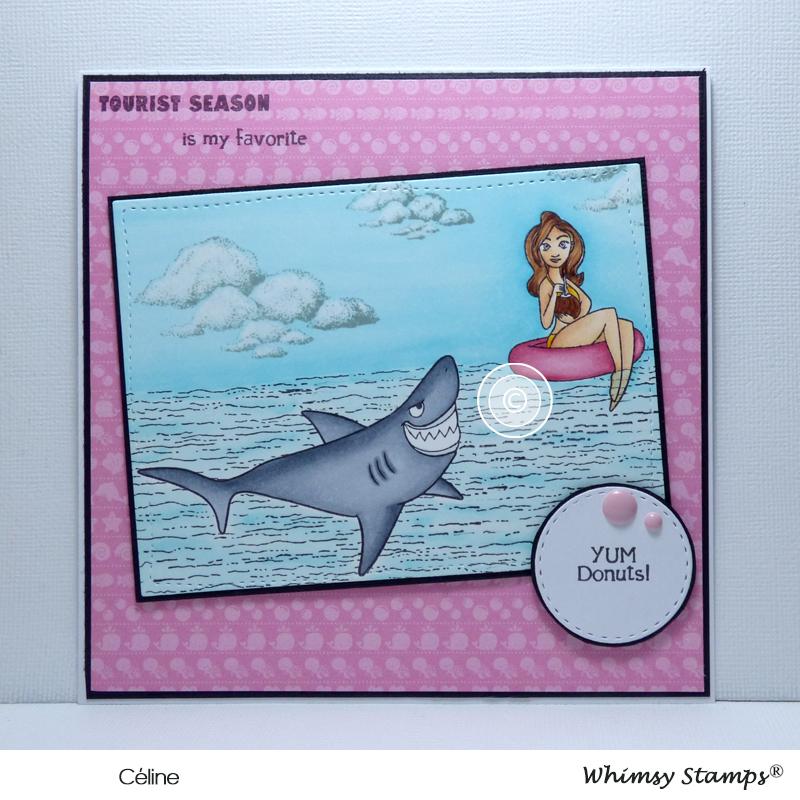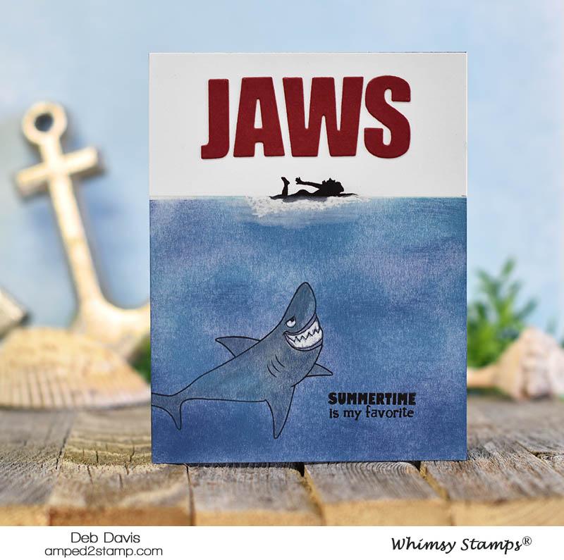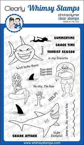 Clearly Whimsy Stamps Collection "Snark Attack" designed by Deb Davis - Amped2Stamp for Whimsy Stamps. This hilarious set is perfect for fun beach/summer cards with shark and swimmer images and crazy funny sentiments. High quality photopolymer clear stamps, use with an acrylic block Approximate size in inches: 4 x 6 polymer sheet.