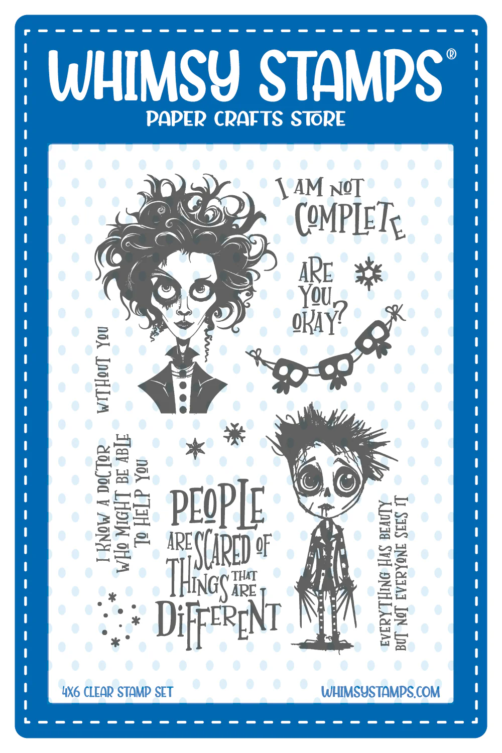 Embrace the whimsical and gothic charm of Edward, a gentle soul who could teach us all something. Our Edward is perfect for adding an artistic touch to not only Halloween cards but Christmas cards, get well cards, missing you cards and more, Also a perfect stamp set for journals, ATC's, and mixed media. Coordinates with our Edward outline die set, sold separately. High quality photopolymer clear stamps, use with an acrylic block Approximate size in inches: 4 x 6 polymer sheet.