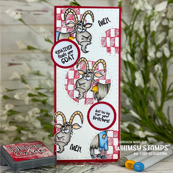Clearly Whimsy Stamps Collection "Cranky Pants" designed by Deb Davis - Amped2Stamp for Whimsy Stamps. Coordinates with our Cranky Pants Outline Die and Cranky Pants Word Die, each sold separately. Create comical birthday cards, ideal for hinting at the process of aging, with this "Old Goat" themed stamp set. A great male counterpart to our Southern Heifer and Southern Cow Bell sets sold separately. Coordinates our Cranky Pants outline die sold separately. High quality photopolymer clear stamps, use with an acrylic block Approximate size in inches: 4 x 6 polymer sheet.