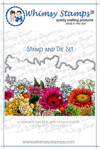 Whimsy Stamps Backgrounds Collection "Gerbera Daisies Background and Outline Die Combo" designed by Deb Davis - Amped2Stamp for Whimsy Stamps. High quality red rubber mounted on EZ Mount foam, use with an acrylic block. Approximate size in inches: 5.5 x 2.6 Metal border die to cut along the top of the flower edge, included. Die will leave a small border of white edging away from the image lines, similar to the look of outline dies for stamped images.
