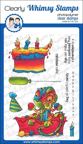 Clearly Whimsy Stamps Collection "Chameleon Party" illustrated by Dustin Pike for Whimsy Stamps. High quality photopolymer clear stamps, use with an acrylic block Approximate size in inches: 4 x 6 polymer sheet.