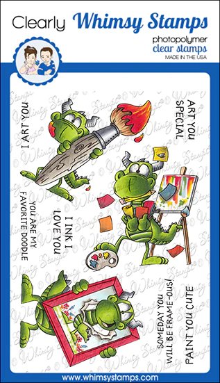 Clearly Whimsy Stamps Collection "Dudley Art" illustrated by Dustin Pike for Whimsy Stamps. High quality photopolymer clear stamps, use with an acrylic block Approximate size in inches: 4 x 6 polymer sheet.