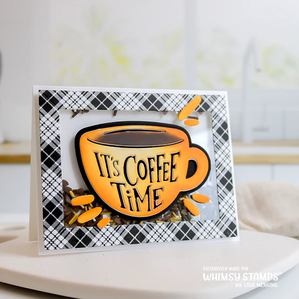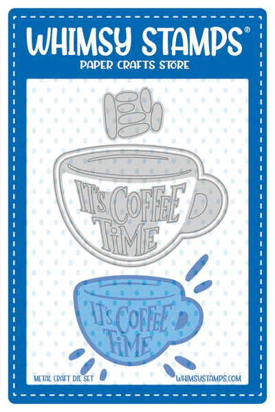 Whimsy Stamps Die Collection "Coffee Time Die Set" designed by Deb Davis and Denise Lynn for Whimsy Stamps. This is a set of 4 dies - Coffee cup and shadow and word die "It's Coffee Time" and little exclamations. For more options use with or without the sentiment.