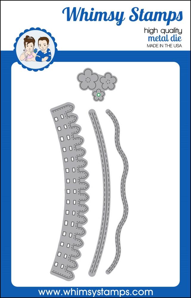 Whimsy Shapeology Die Collection "Kinetic Curved Hills Die Set" designed by Jennifer Dove and Denise Lynn for Whimsy Stamps. Our line of Kinetic Dies make it easy to create fun cards and projects which incorporate movement. Designed to work with A2 or larger sized cards. Set includes 4 dies - 3 different border die designs and flowers. Pair these with our other No-See and Kinetic Dies to create slider cards, hidden sliders, movement cards, and more. All Kinetic Dies have been designed to be used together or separately.