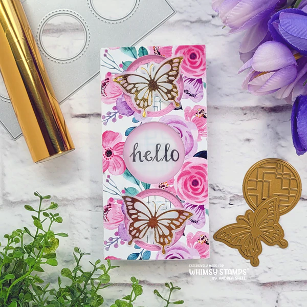 Whimsy Stamps Die Collection "Mini Slim Tri-Fold Die Set" designed by Denise Lynn and Deb Davis for Whimsy Stamps. This unique die comes as a set of 5 dies and is a great value for all we've packed into this die set for you. The largest die is approximately 6x9 inches and is intended to create with a single cut, a windowed tri-fold card base in a mini slimline size. Once cut out you can fold it on the score lines so the 3 small stitched windows are on the inside or on the outside for different looks. There are also 4 different accent circle included. SO many cool options with this fun tri-fold die. And for even more design options coordinates with our Peekaboo Dots clear stamp set sold separately.