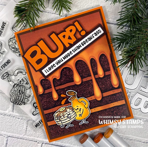 Whimsy Stamps Die Collection "Slurp! Word Die Set" designed by Deb Davis and Denise Lynn for Whimsy Stamps. This is a set of 6 dies - includes the letters SL, U, RP, B and an exclamation point along with some drool or water droplets. Use to create the words SLURP or BURP. Perfect for coffee addicts, slobbery pet kisses, guy cards, beer, hungry monsters, yummy foods scrapbook pages and so much more.