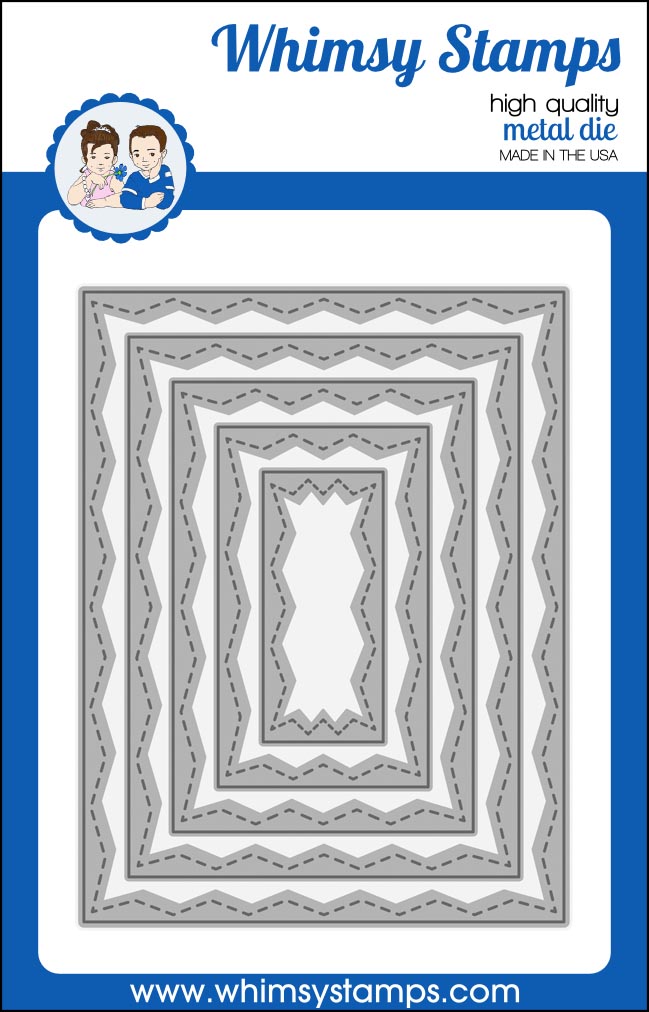 Whimsy Shapeology Die Collection "Zig Zag Stitched Rectangles Die Set" designed by Denise Lynn Whimsy Stamps. This is a set of 5 different dies - decreasing gradually in size, perfect to matte together. Each containing a zig zag stitched edge.