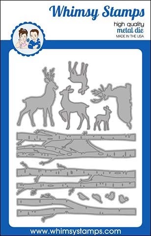 Whimsy Shapeology Die Collection "Forest Majesty Die Set" designed by Denise Lynn and Deb Davis for Whimsy Stamps. This beautiful woodland theme die set makes it easy to create beautiful scenic cards and projects. Can be used to as accents or even as stand alone elements and focal points. Designed to work with A2 or larger sized cards. Set includes 12 dies - use these accent dies to create a wooded landscape with deer and trees along with some bird accents.
