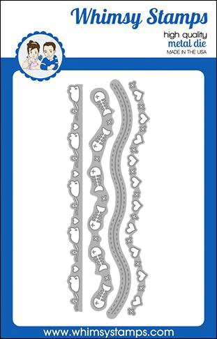 Whimsy Stamps Die Collection "Fish and Mice Border Die Set" designed by Denise Lynn and Deb Davis for Whimsy Stamps. These dies create fun edge details of fish, mice, hearts and x's. Also includes one border die edge cutter that mimics the shape of some of the other dies. This is a set of 4 different dies. All about 6" in length.
