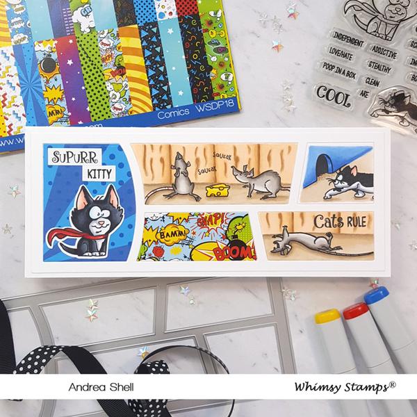 Whimsy Shapeology Die Collection "Slimline Wonky Window 1 Die" designed by Denise Lynn and Deb Davis for Whimsy Stamps. Perfect addition to our comic collection with the comic strip inspired layout. Another awesome Slimline Die added to our growing collection to help you create tall and skinny cards quickly and easily. This die is 8.25 x 3.25 with windows - perfect for shaker cards, hidden surprises, and peekaboo critters. Slimline cards fit in legal size envelopes.