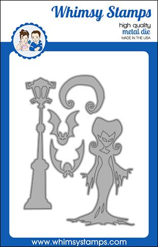 Whimsy Shapeology Die Collection "Elvira Moonlighting Die Set" designed by Denise Lynn and Deb Davis for Whimsy Stamps. Set of 5 dies - Elvira, bats, moon, and a lamppost - perfect for adding to Halloween creations. Combine with our Dracula Going Batty Set for even more Halloween fun, sold separately.