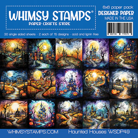 Whimsy Stamps 6x6 designer paper packs - "Haunted Houses". 30 single-sided sheets of high-quality papers with a subtle sheen. 15 designs/2 sheets of each. Perfect for card making, scrapbooking, and or paper hoarding. Acid and lignin free. Individual sheets packaged in clear bag.