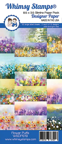 Whimsy Stamps Slimline designer paper packs - "Flower Puffs" - designed by Deb Davis for Whimsy Stamps. 30 single-sided 8.5 x 3.5 inch sheets of high quality, heavy weight papers with a beautiful sheen. 15 designs/2 sheets of each. Perfect for card making, scrapbooking and or paper hoarding. Acid and lignin free. Individual sheets packaged in clear bag.